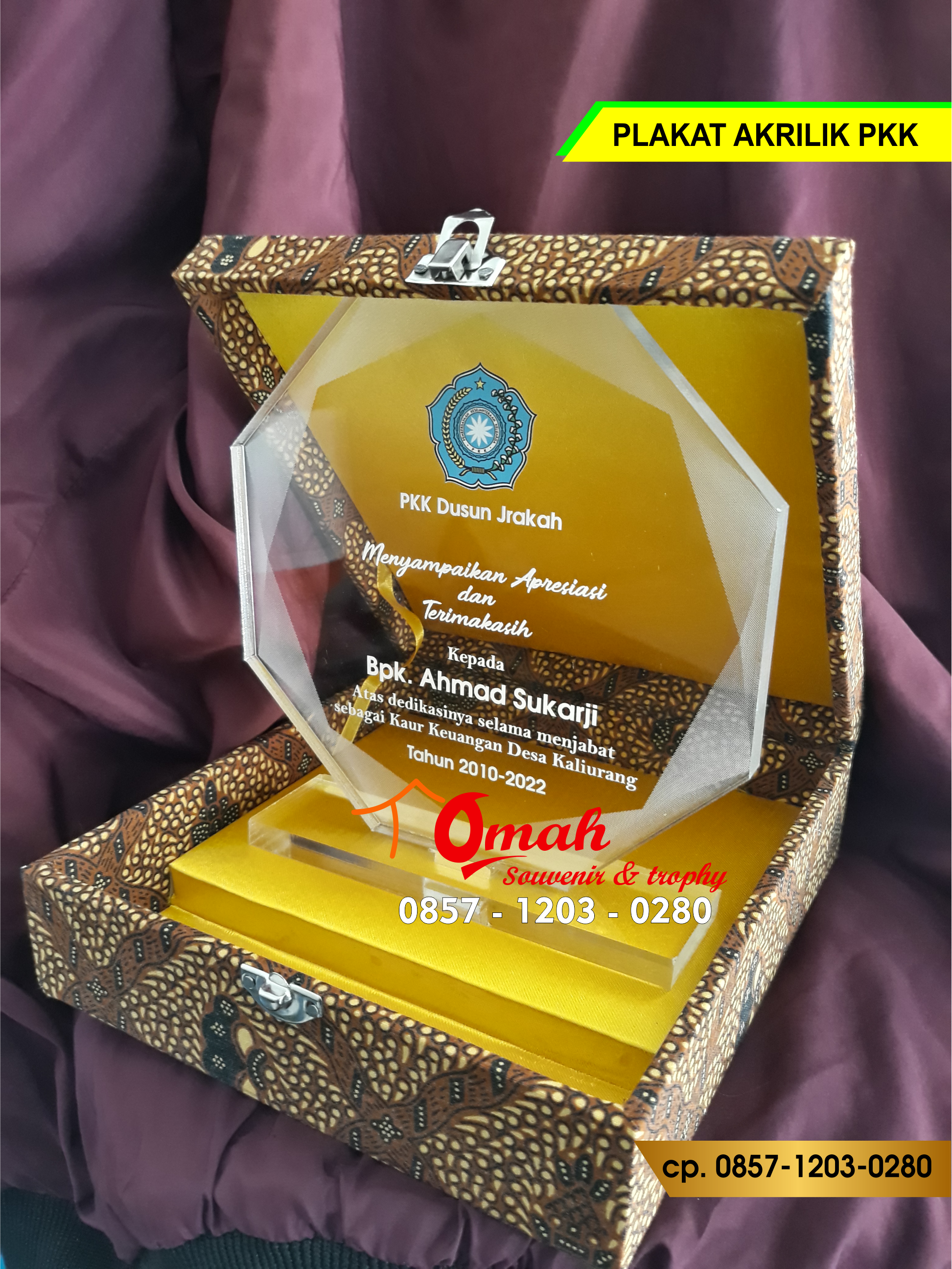Halo sobat omah souvenir & trophy. Plakat Akrilik merupakan plakat dengan desain coustem yang bisa di request oleh pemesan. Dengan desain suka – suka dari pembeli merupakan keunggulan kami.
